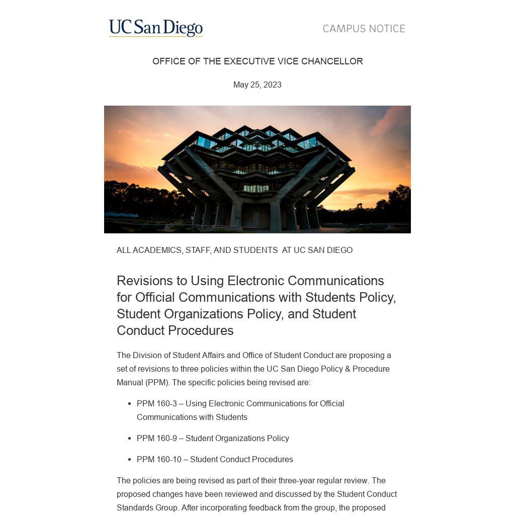 The Division of Student Affairs and Office of Student Conduct are proposing a set of revisions to three policies within the UC San Diego Policy & Procedure Manual (PPM). The specific policies being revised are: