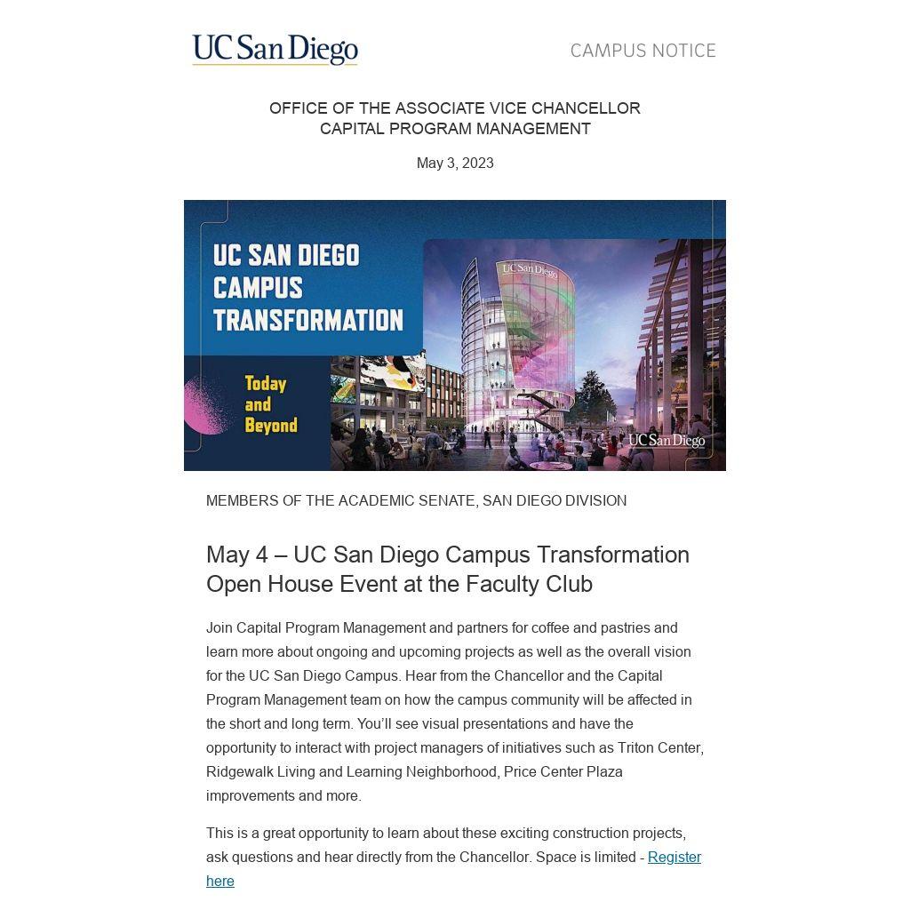 Join Capital Program Management and partners for coffee and pastries and learn more about ongoing and upcoming projects as well as the overall vision for the UC San Diego Campus. Hear from the Chancellor and the Capital Program Management team on how the campus community will be affected in the short and long term. You’ll see visual presentations and have the opportunity to interact with project managers of initiatives such as Triton Center, Ridgewalk Living and Learning Neighborhood, Price Center Plaza improvements and more.