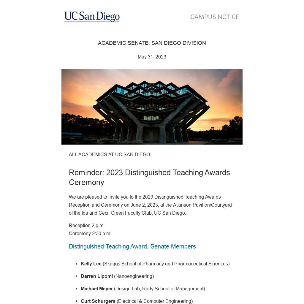 We are pleased to invite you to the 2023 Distinguished Teaching Awards Reception and Ceremony on June 2, 2023, at the Atkinson Pavilion/Courtyard of the Ida and Cecil Green Faculty Club, UC San Diego.