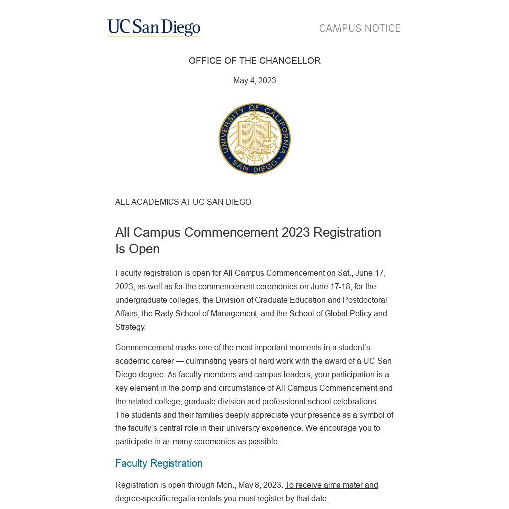 Faculty registration is open for All Campus Commencement on Sat., June 17, 2023, as well as for the commencement ceremonies on June 17-18, for the undergraduate colleges, the Division of Graduate Education and Postdoctoral Affairs, the Rady School of Management, and the School of Global Policy and Strategy.