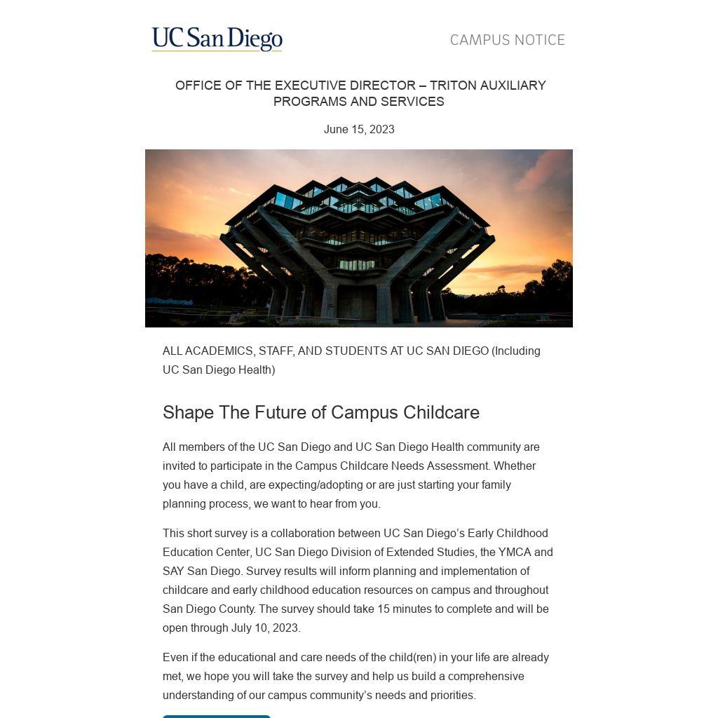 This short survey is a collaboration between UC San Diego’s Early Childhood Education Center, UC San Diego Division of Extended Studies, the YMCA and SAY San Diego. Survey results will inform planning and implementation of childcare and early childhood education resources on campus and throughout San Diego County. The survey should take 15 minutes to complete and will be open through July 10, 2023.