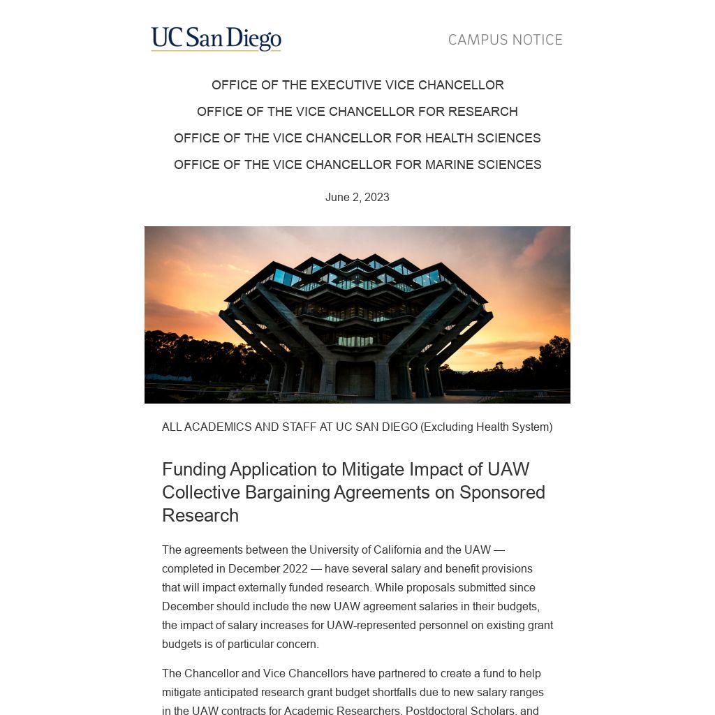 The Chancellor and Vice Chancellors have partnered to create a fund to help mitigate anticipated research grant budget shortfalls due to new salary ranges in the UAW contracts for Academic Researchers, Postdoctoral Scholars, and Graduate Student Researchers. The overarching goal of this Research Relief Fund is to prevent layoffs of personnel without reducing the scope of research on externally funded grants.