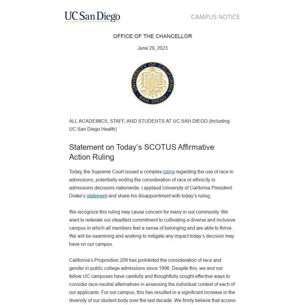 Today, the Supreme Court issued a complex ruling regarding the use of race in admissions, potentially ending the consideration of race or ethnicity in admissions decisions nationwide. I applaud University of California President Drake’s statement and share his disappointment with today’s ruling.
