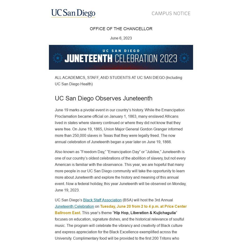 Also known as “Freedom Day,” “Emancipation Day” or “Jubilee,” Juneteenth is one of our country’s oldest celebrations of the abolition of slavery, but not every American is familiar with the observance. This year, we are hopeful that many more people in our UC San Diego community will take the opportunity to learn more about Juneteenth and explore the history and meaning of this annual event. Now a federal holiday, this year Juneteenth will be observed on Monday, June 19, 2023.