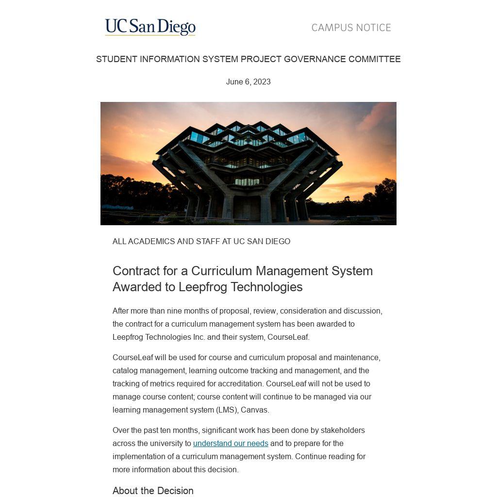 Following the CRP sessions, scores for each vendor were tabulated, which were then presented to project governance and the project sponsor, Executive Vice Chancellor Elizabeth H. Simmons. Based on the scores, Leepfrog Technologies and their system, CourseLeaf, was the clear winner. The project team and governance committee look forward to working with Leepfrog Technologies, the Academic Senate and the entire university community to implement CourseLeaf and improve our course-, curriculum- and catalog-related processes. CourseLeaf is also currently in use at UC Berkeley and UC Irvine.