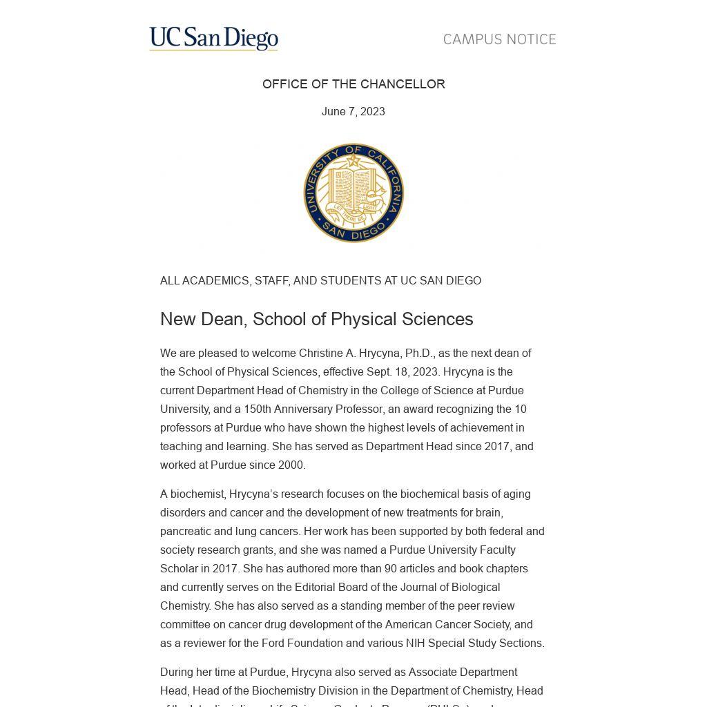 Please join us in congratulating incoming Dean Hrycyna on her appointment. Her commitment to research, as well as furthering academic and teaching excellence will serve the School of Physical Sciences, and our university, well.
