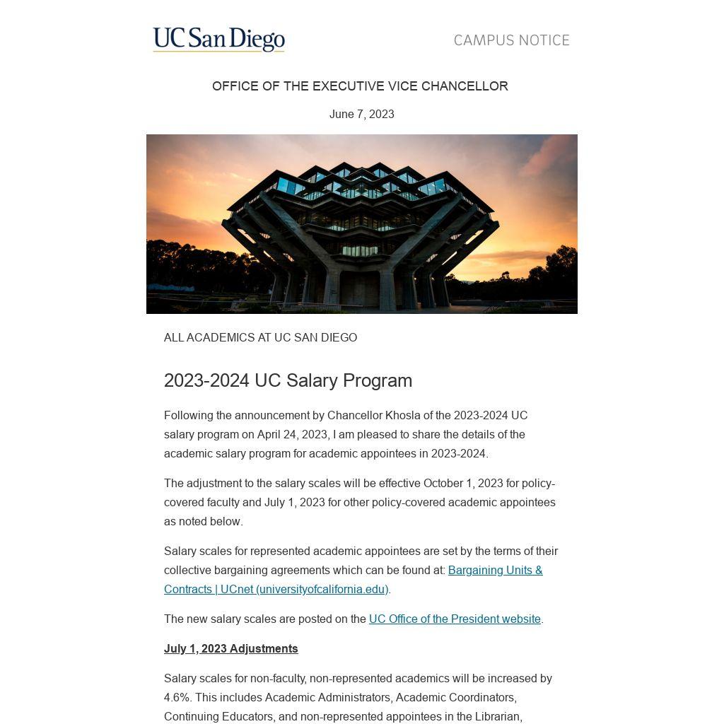 Following the announcement by Chancellor Khosla of the 2023-2024 UC salary program on April 24, 2023, I am pleased to share the details of the academic salary program for academic appointees in 2023-2024.