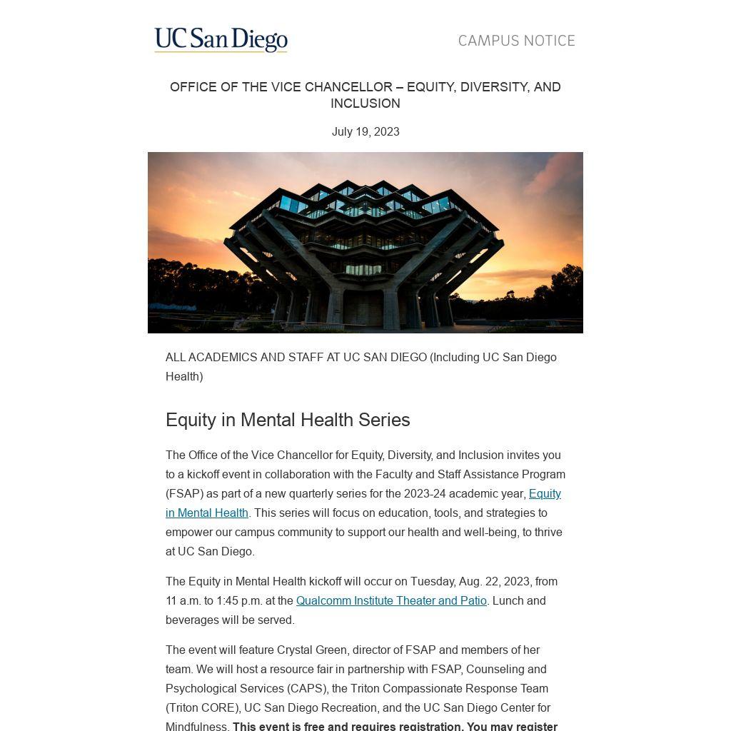 The Office of the Vice Chancellor for Equity, Diversity, and Inclusion invites you to a kickoff event in collaboration with the Faculty and Staff Assistance Program (FSAP) as part of a new quarterly series for the 2023-24 academic year, Equity in Mental Health. This series will focus on education, tools, and strategies to empower our campus community to support our health and well-being, to thrive at UC San Diego.