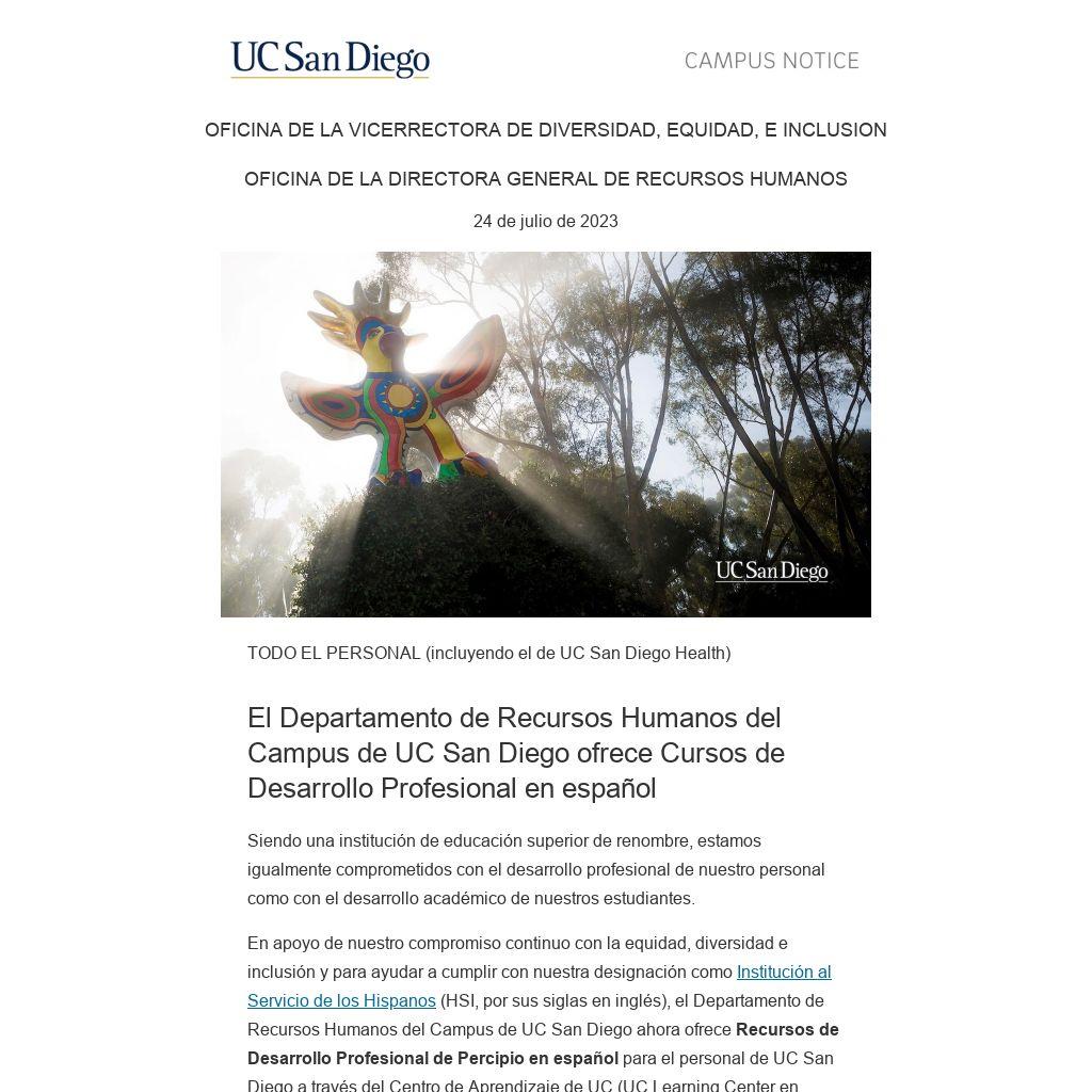 En apoyo de nuestro compromiso continuo con la equidad, diversidad e inclusión y para ayudar a cumplir con nuestra designación como Institución al Servicio de los Hispanos (HSI, por sus siglas en inglés), el Departamento de Recursos Humanos del Campus de UC San Diego ahora ofrece Recursos de Desarrollo Profesional de Percipio en español para el personal de UC San Diego a través del Centro de Aprendizaje de UC (UC Learning Center en inglés), incluidos cursos electrónicos, libros y audiolibros.