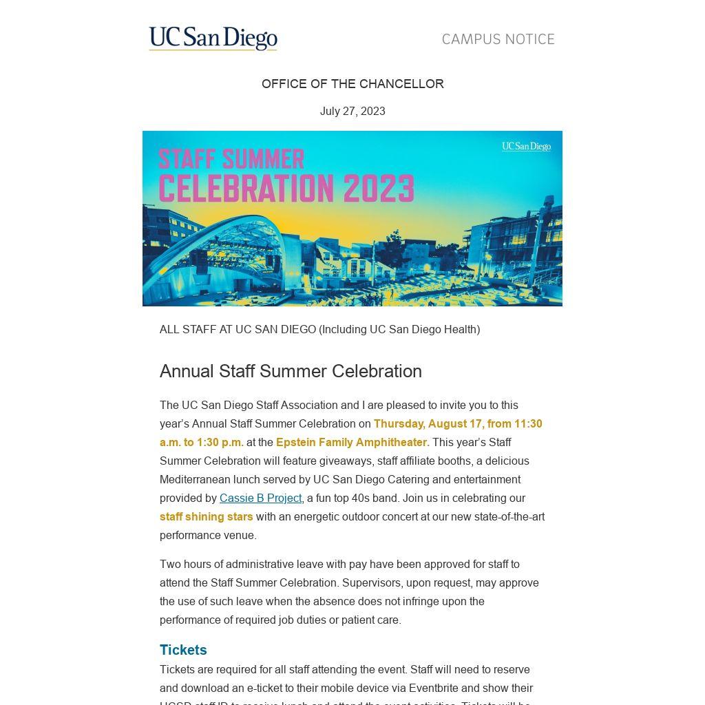 The UC San Diego Staff Association and I are pleased to invite you to this year’s Annual Staff Summer Celebration on Thursday, August 17, from 11:30 a.m. to 1:30 p.m. at the Epstein Family Amphitheater. This year’s Staff Summer Celebration will feature giveaways, staff affiliate booths, a delicious Mediterranean lunch served by UC San Diego Catering and entertainment provided by Cassie B Project, a fun top 40s band. Join us in celebrating our staff shining stars with an energetic outdoor concert at our new state-of-the-art performance venue.