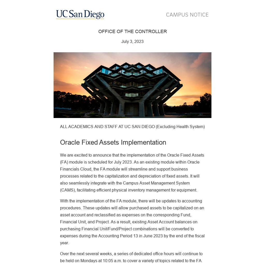 We are excited to announce that the implementation of the Oracle Fixed Assets (FA) module is scheduled for July 2023. As an existing module within Oracle Financials Cloud, the FA module will streamline and support business processes related to the capitalization and depreciation of fixed assets. It will also seamlessly integrate with the Campus Asset Management System (CAMS), facilitating efficient physical inventory management for equipment.
