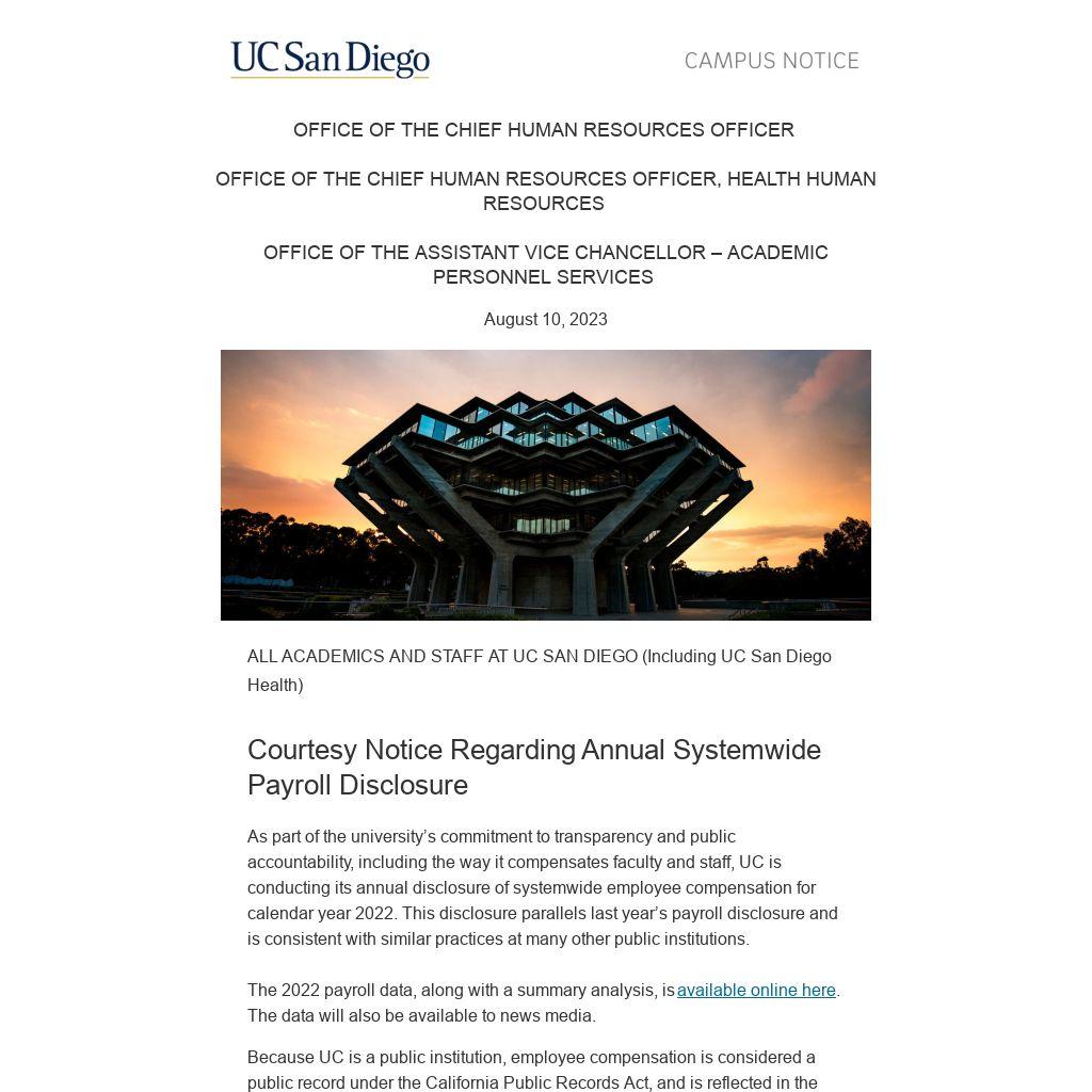 As part of the university’s commitment to transparency and public accountability, including the way it compensates faculty and staff, UC is conducting its annual disclosure of systemwide employee compensation for calendar year 2022. This disclosure parallels last year’s payroll disclosure and is consistent with similar practices at many other public institutions.