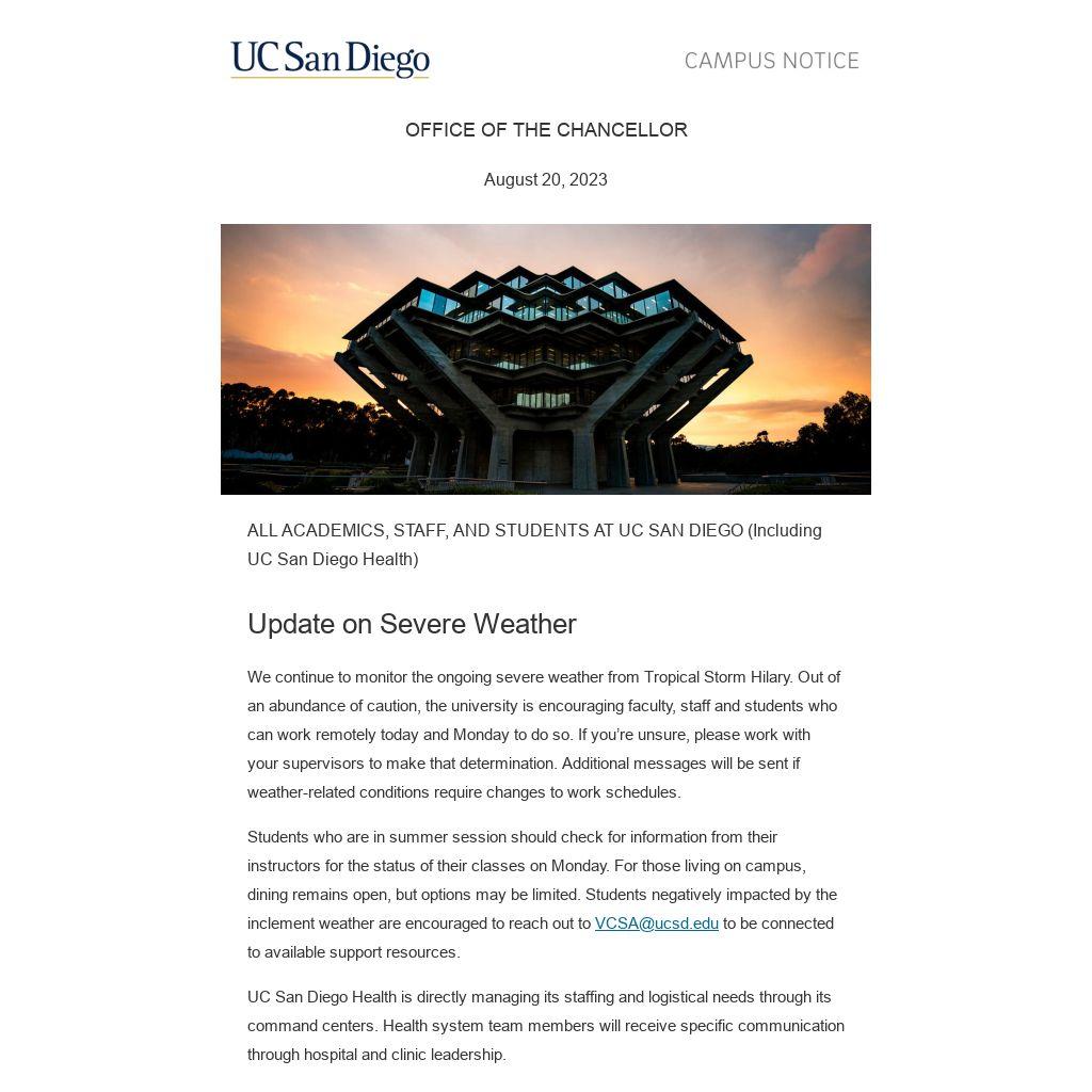 We continue to monitor the ongoing severe weather from Tropical Storm Hilary. Out of an abundance of caution, the university is encouraging faculty, staff and students who can work remotely today and Monday to do so. If you’re unsure, please work with your supervisors to make that determination. Additional messages will be sent if weather-related conditions require changes to work schedules.