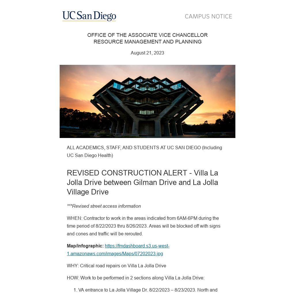 - Gilman Dr to VA entrance 8/26/2023. North and South bound lanes closed to regular traffic. Emergency vehicle access only.