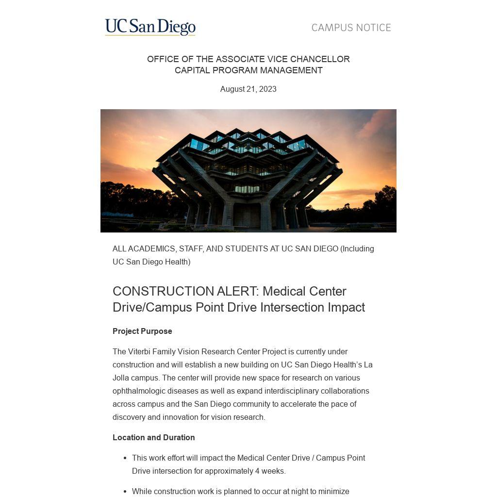 - This work effort will impact the Medical Center Drive / Campus Point Drive intersection for approximately 4 weeks.