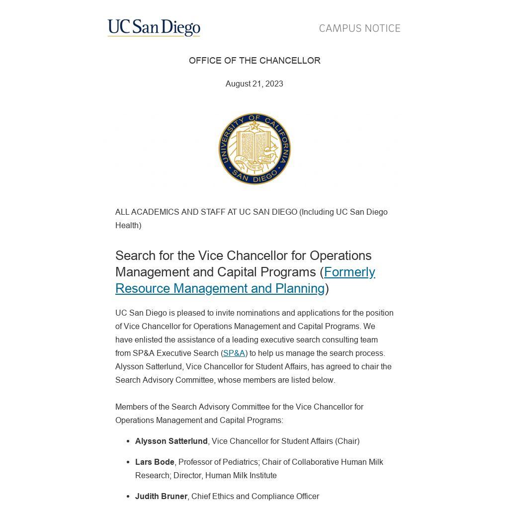 UC San Diego is pleased to invite nominations and applications for the position of Vice Chancellor for Operations Management and Capital Programs. We have enlisted the assistance of a leading executive search consulting team from SP&A Executive Search (SP&A) to help us manage the search process. Alysson Satterlund, Vice Chancellor for Student Affairs, has agreed to chair the Search Advisory Committee, whose members are listed below.