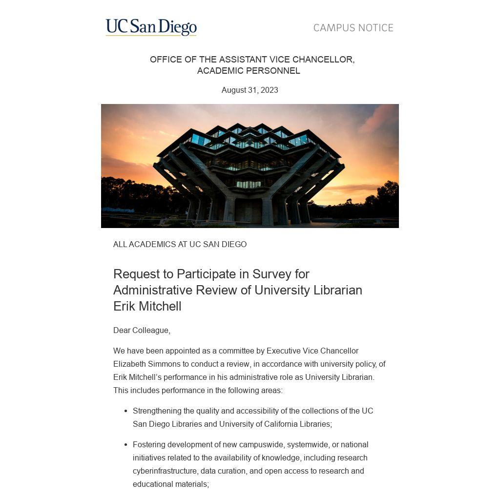 Request to Participate in Survey for Administrative Review of University Librarian Erik Mitchell
