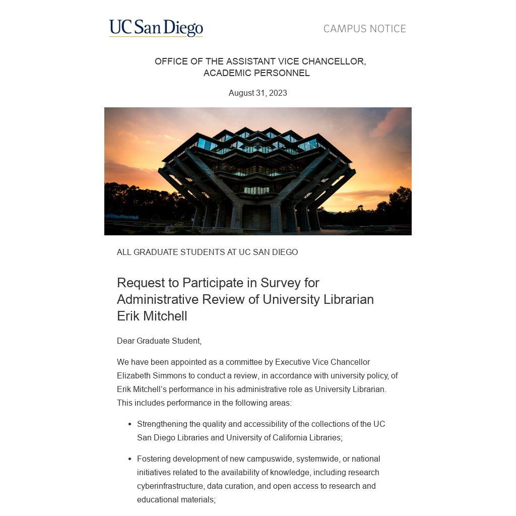 Request to Participate in Survey for Administrative Review of University Librarian Erik Mitchell