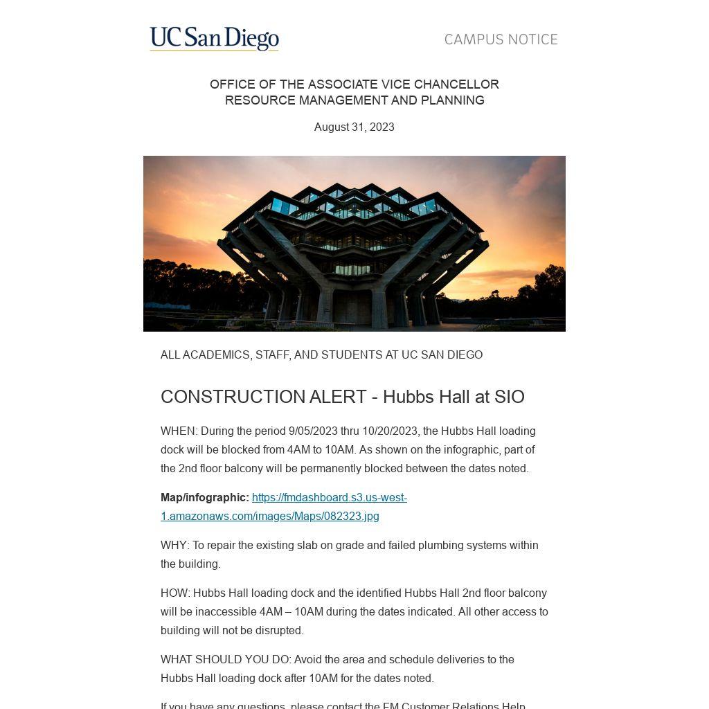 WHEN: During the period 9/05/2023 thru 10/20/2023, the Hubbs Hall loading dock will be blocked from 4AM to 10AM. As shown on the infographic, part of the 2nd floor balcony will be permanently blocked between the dates noted.