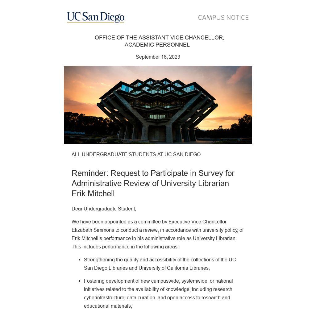 Reminder: Request to Participate in Survey for Administrative Review of University Librarian Erik Mitchell