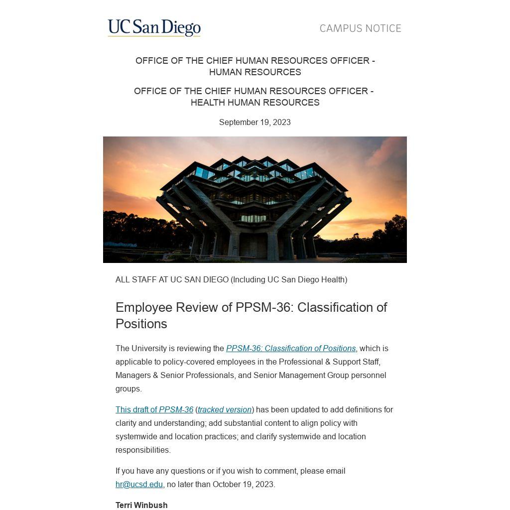If you have any questions or if you wish to comment, please email hr@ucsd.edu, no later than October 19, 2023.