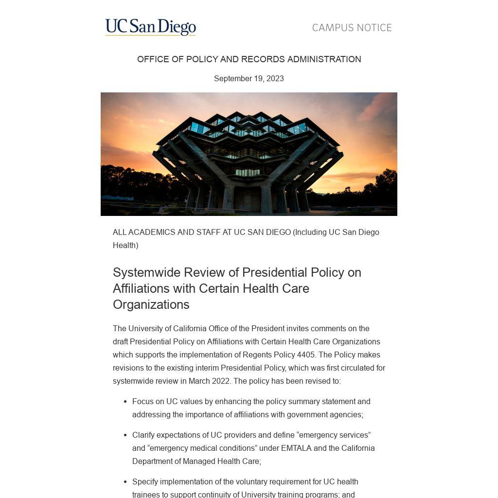 The University of California Office of the President invites comments on the draft Presidential Policy on Affiliations with Certain Health Care Organizations which supports the implementation of Regents Policy 4405. The Policy makes revisions to the existing interim Presidential Policy, which was first circulated for systemwide review in March 2022. The policy has been revised to: