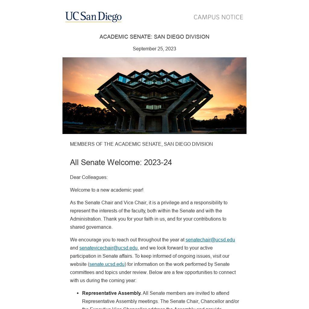 We encourage you to reach out throughout the year at senatechair@ucsd.edu and senatevicechair@ucsd.edu, and we look forward to your active participation in Senate affairs. To keep informed of ongoing issues, visit our website (senate.ucsd.edu) for information on the work performed by Senate committees and topics under review. Below are a few opportunities to connect with us during the coming year: