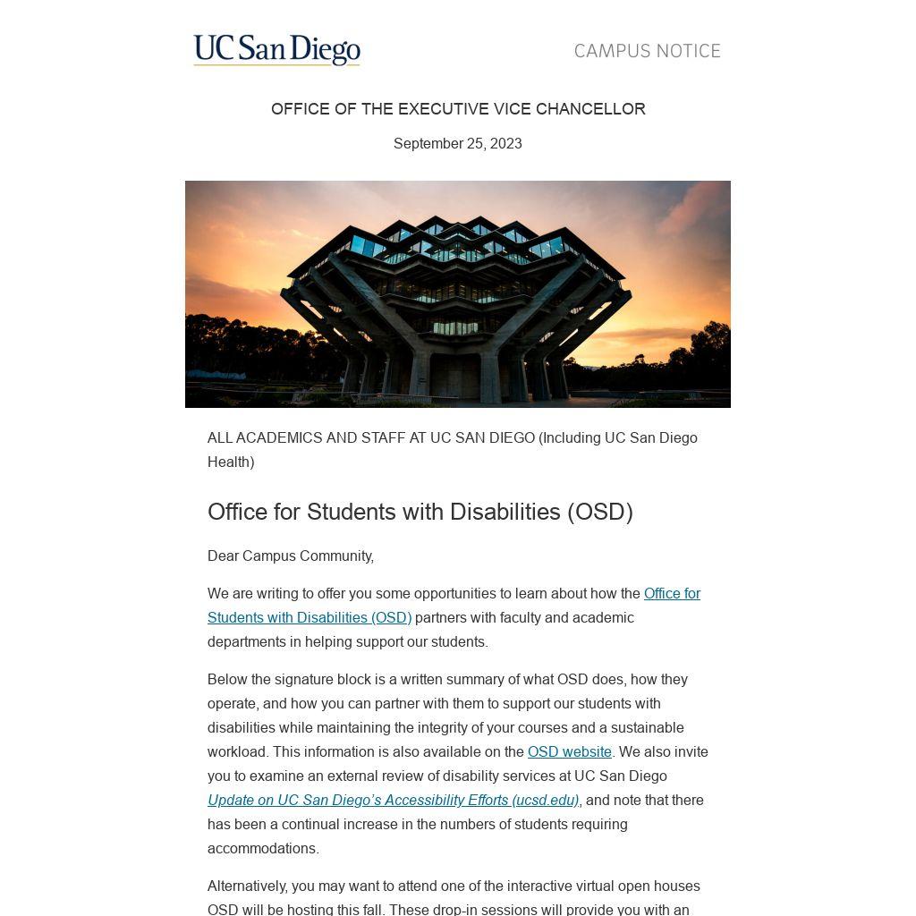 - What if I want more information about disability services in general? You may find more information on the OSD website at Faculty & Staff Supporting Students and on the UCOP website at Academic Accommodations | UCOP.