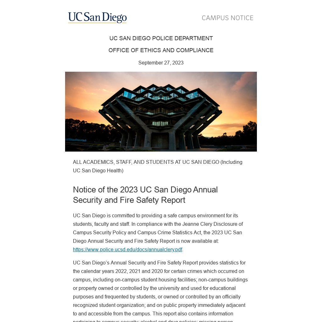 UC San Diego is committed to providing a safe campus environment for its students, faculty and staff. In compliance with the Jeanne Clery Disclosure of Campus Security Policy and Campus Crime Statistics Act, the 2023 UC San Diego Annual Security and Fire Safety Report is now available at: https://www.police.ucsd.edu/docs/annualclery.pdf.