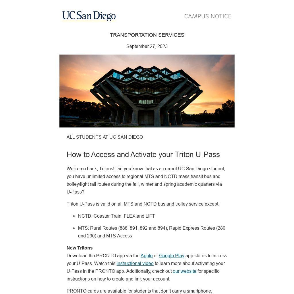 Welcome back, Tritons! Did you know that as a current UC San Diego student, you have unlimited access to regional MTS and NCTD mass transit bus and trolley/light rail routes during the fall, winter and spring academic quarters via U-Pass?