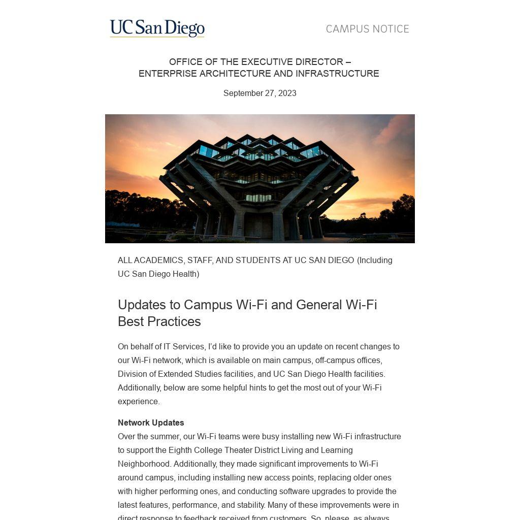 On behalf of IT Services, I’d like to provide you an update on recent changes to our Wi-Fi network, which is available on main campus, off-campus offices, Division of Extended Studies facilities, and UC San Diego Health facilities. Additionally, below are some helpful hints to get the most out of your Wi-Fi experience.