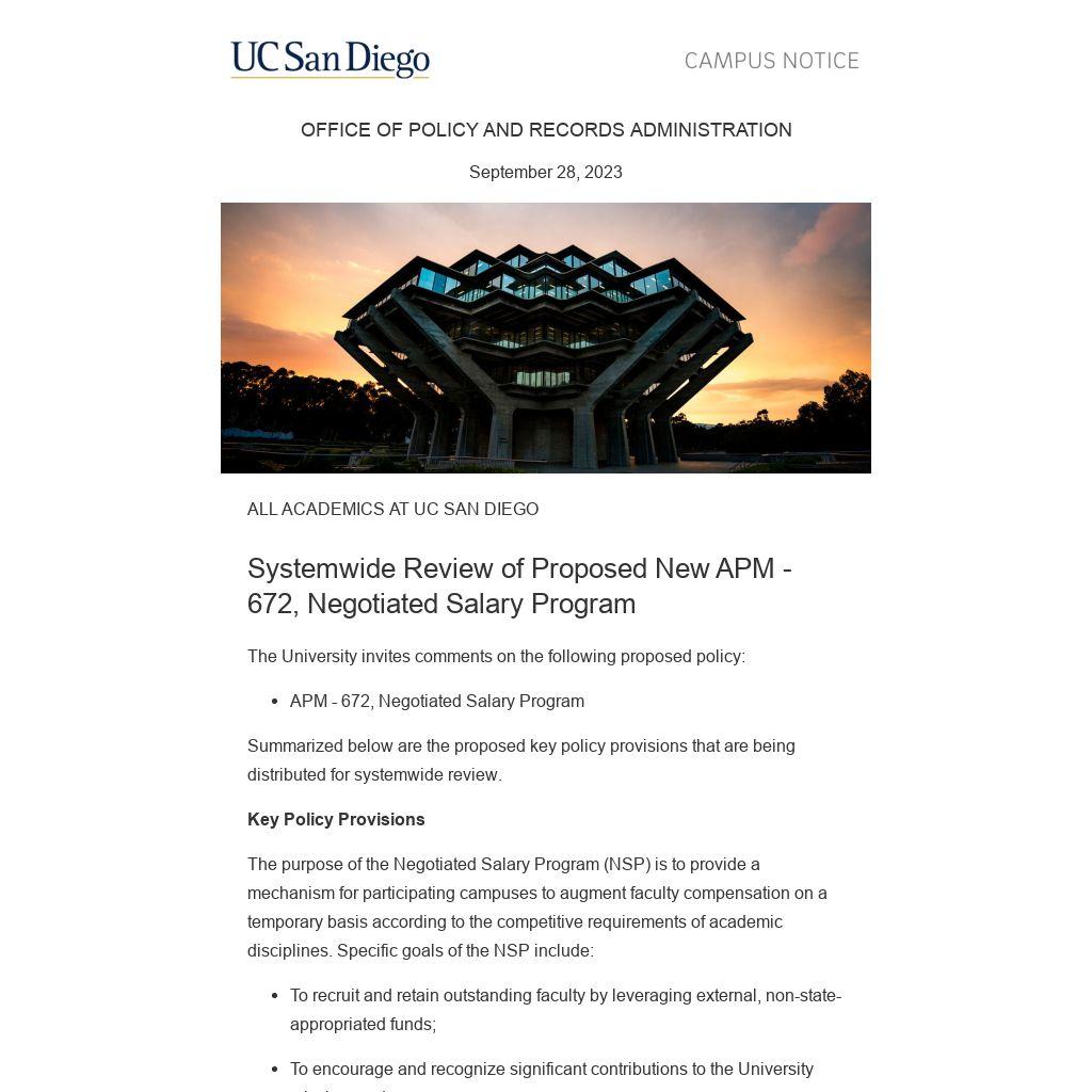The draft policy is posted here. If you have any questions or if you wish to comment, please contact Paula Johnson in Policy and Records Administration at policy@ucsd.edu no later than December 8, 2023.