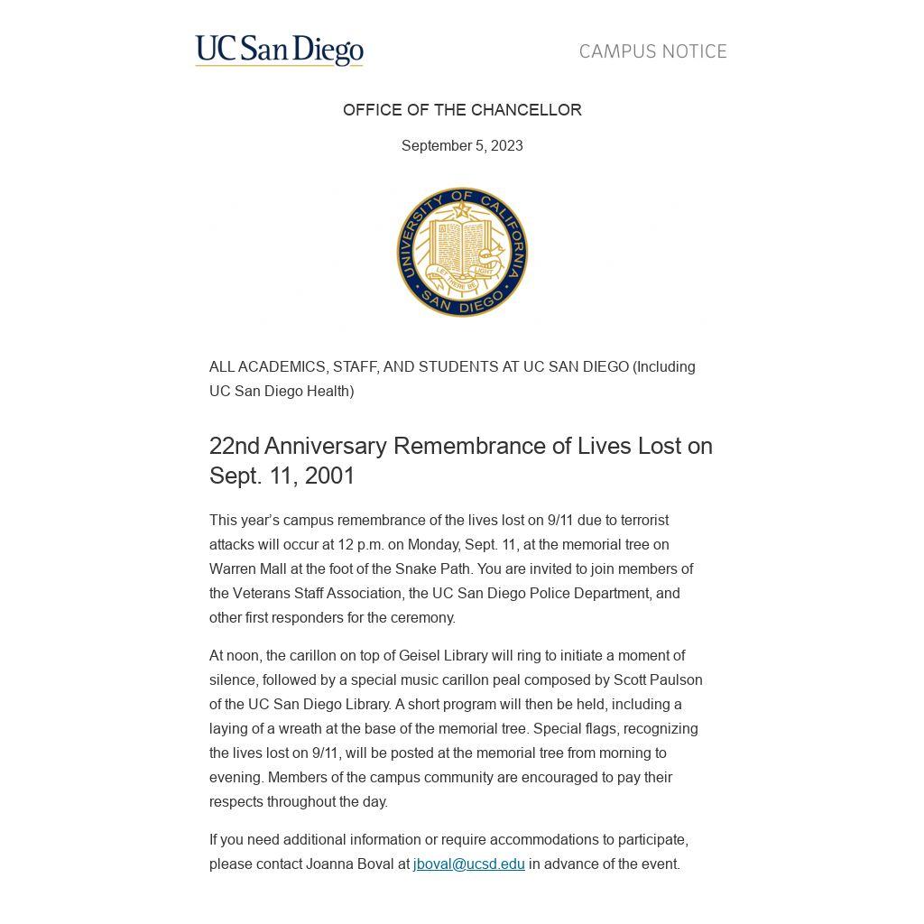 At noon, the carillon on top of Geisel Library will ring to initiate a moment of silence, followed by a special music carillon peal composed by Scott Paulson of the UC San Diego Library. A short program will then be held, including a laying of a wreath at the base of the memorial tree. Special flags, recognizing the lives lost on 9/11, will be posted at the memorial tree from morning to evening. Members of the campus community are encouraged to pay their respects throughout the day.