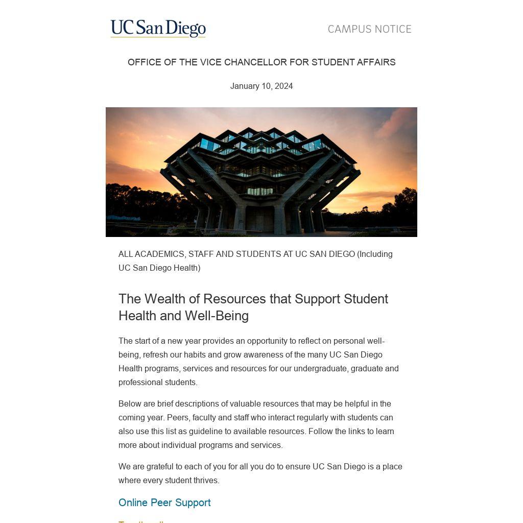 The balanced health and well-being of our students allows them to more fully experience the vast array of enrichment opportunities available at UC San Diego. We invite you to share these resources broadly.