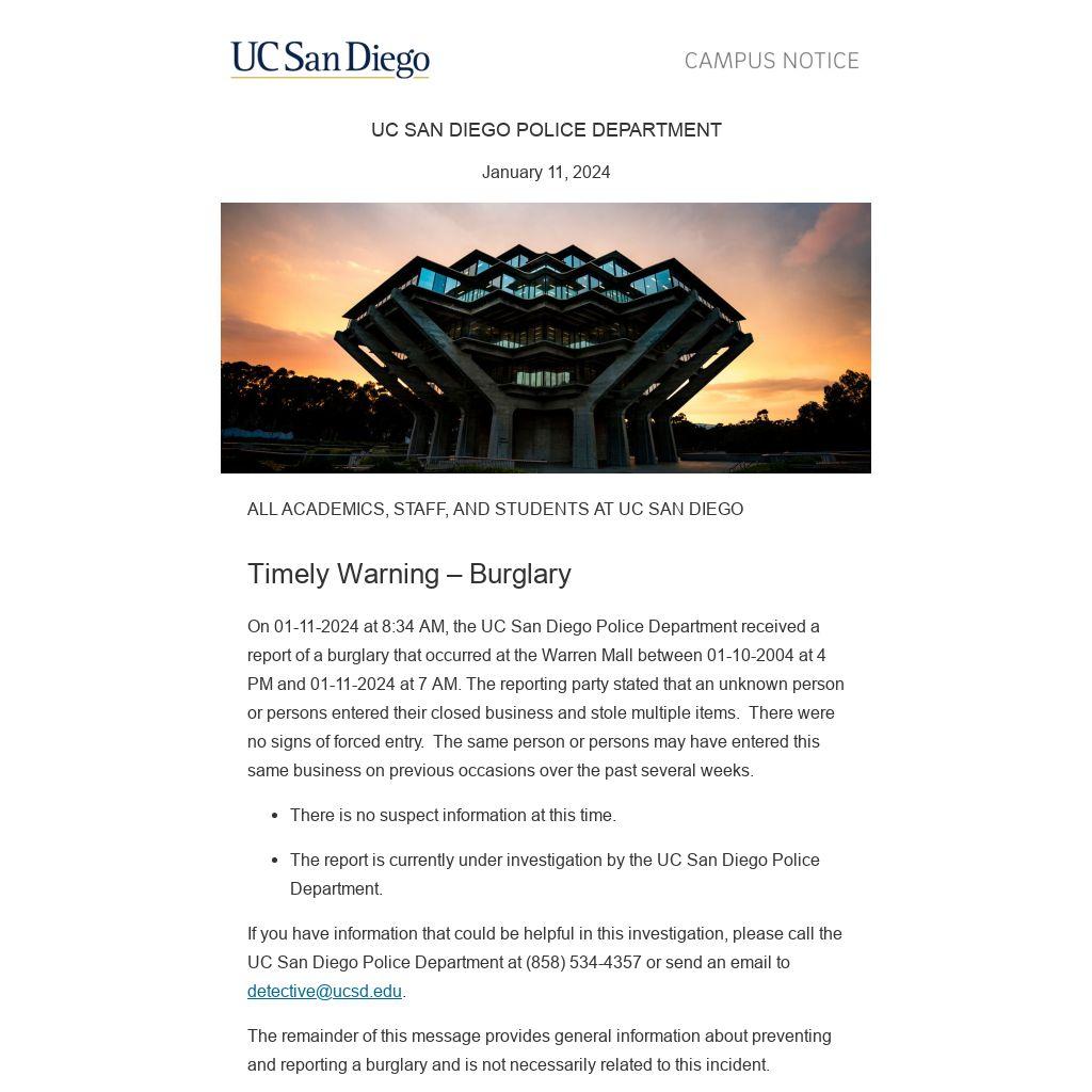 On 01-11-2024 at 8:34 AM, the UC San Diego Police Department received a report of a burglary that occurred at the Warren Mall between 01-10-2004 at 4 PM and 01-11-2024 at 7 AM. The reporting party stated that an unknown person or persons entered their closed business and stole multiple items. There were no signs of forced entry. The same person or persons may have entered this same business on previous occasions over the past several weeks.