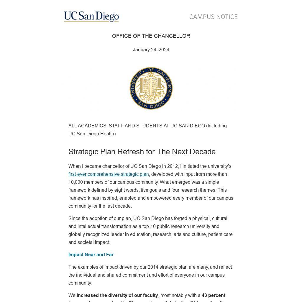 When I became chancellor of UC San Diego in 2012, I initiated the university’s first-ever comprehensive strategic plan, developed with input from more than 10,000 members of our campus community. What emerged was a simple framework defined by eight words, five goals and four research themes. This framework has inspired, enabled and empowered every member of our campus community for the last decade.