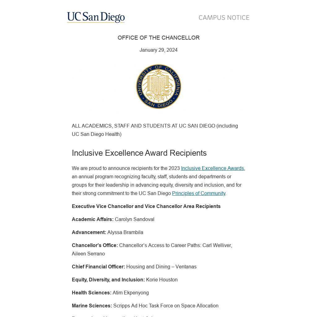 Recipients were evaluated by a committee of representatives from all vice chancellor areas after receiving nominations made by the UC San Diego community in October 2023.