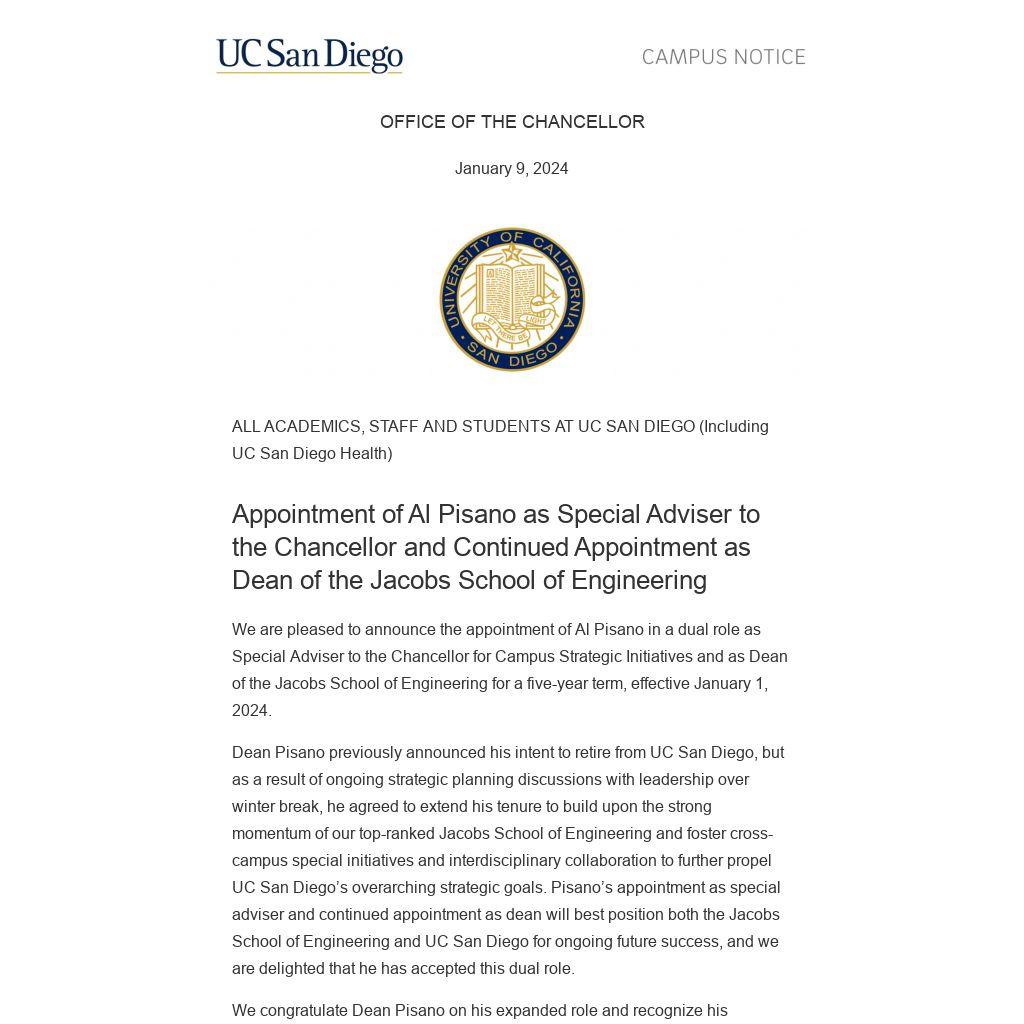 We are pleased to announce the appointment of Al Pisano in a dual role as Special Adviser to the Chancellor for Campus Strategic Initiatives and as Dean of the Jacobs School of Engineering for a five-year term, effective January 1, 2024.