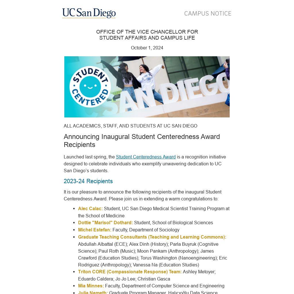 Launched last spring, the Student Centeredness Award is a recognition initiative designed to celebrate individuals who exemplify unwavering dedication to UC San Diego’s students.