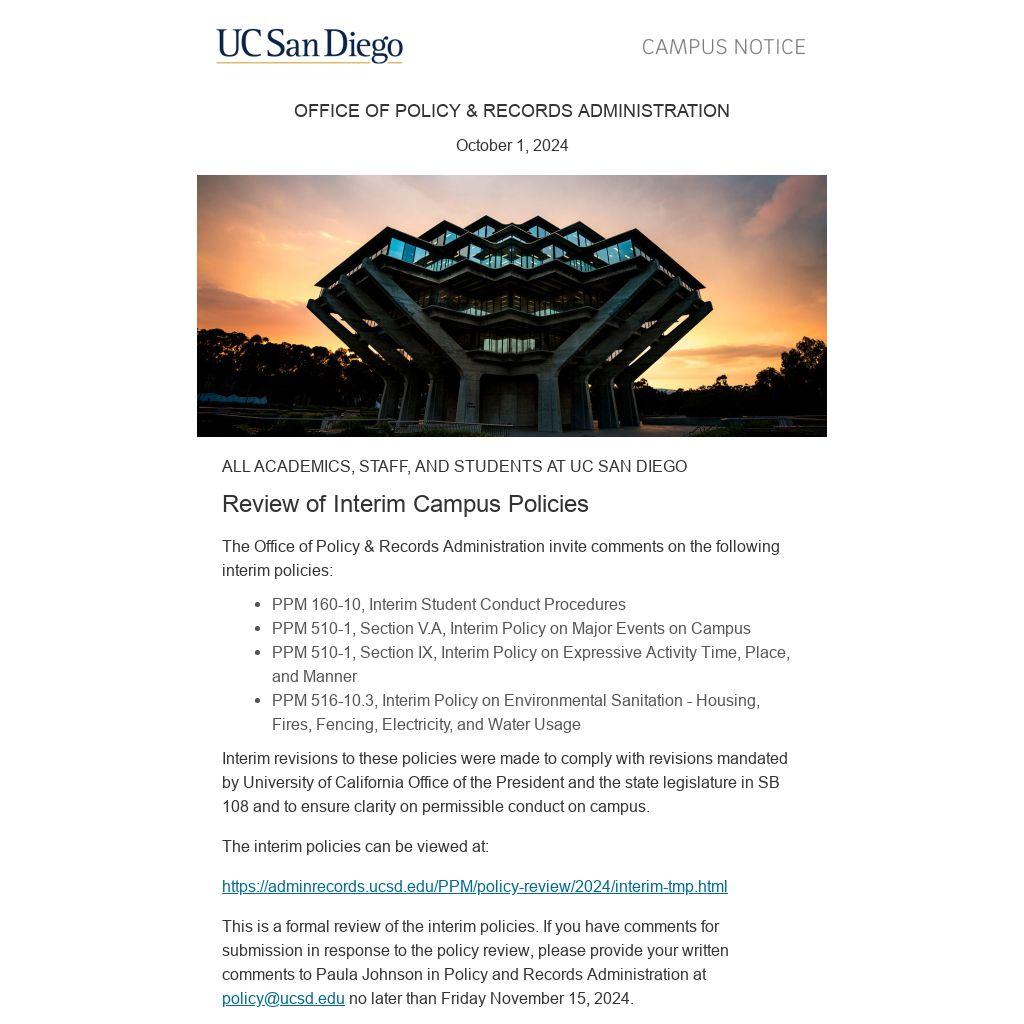 This is a formal review of the interim policies. If you have comments for submission in response to the policy review, please provide your written comments to Paula Johnson in Policy and Records Administration at policy@ucsd.edu no later than Friday November 15, 2024.