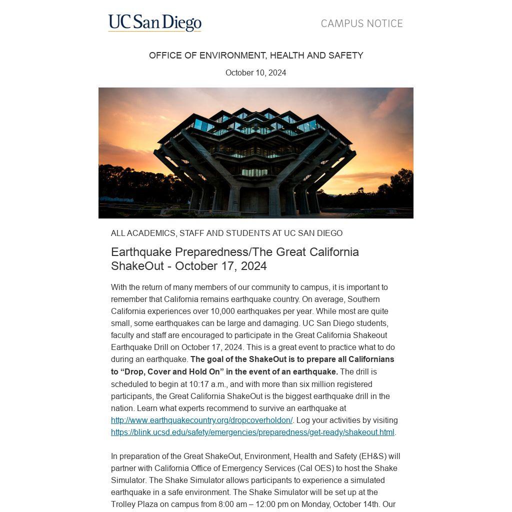 With the return of many members of our community to campus, it is important to remember that California remains earthquake country. On average, Southern California experiences over 10,000 earthquakes per year. While most are quite small, some earthquakes can be large and damaging. UC San Diego students, faculty and staff are encouraged to participate in the Great California Shakeout Earthquake Drill on October 17, 2024. This is a great event to practice what to do during an earthquake. The goal of the ShakeOut is to prepare all Californians to “Drop, Cover and Hold On” in the event of an earthquake. The drill is scheduled to begin at 10:17 a.m., and with more than six million registered participants, the Great California ShakeOut is the biggest earthquake drill in the nation. Learn what experts recommend to survive an earthquake at http://www.earthquakecountry.org/dropcoverholdon/. Log your activities by visiting https://blink.ucsd.edu/safety/emergencies/preparedness/get-ready/shakeout.html.
