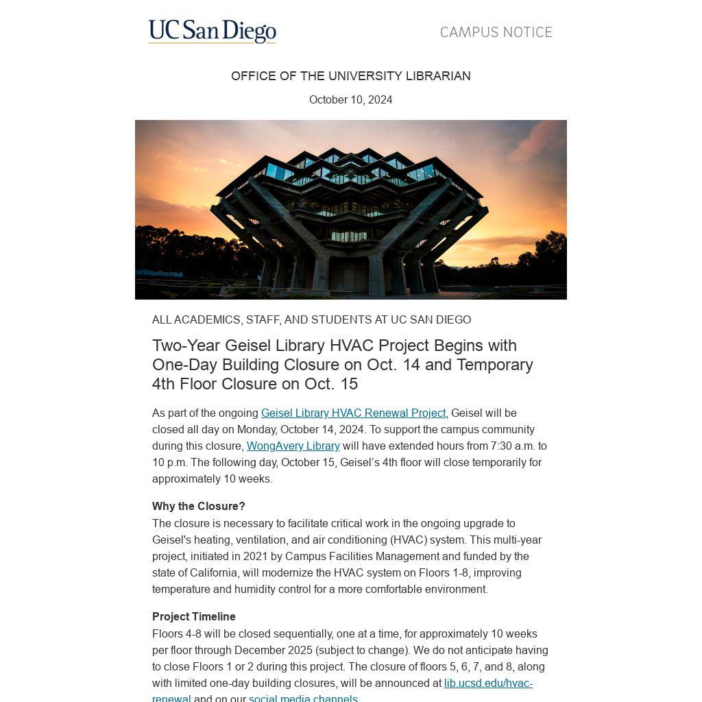 As part of the ongoing Geisel Library HVAC Renewal Project, Geisel will be closed all day on Monday, October 14, 2024. To support the campus community during this closure, WongAvery Library will have extended hours from 7:30 a.m. to 10 p.m. The following day, October 15, Geisel’s 4th floor will close temporarily for approximately 10 weeks.
