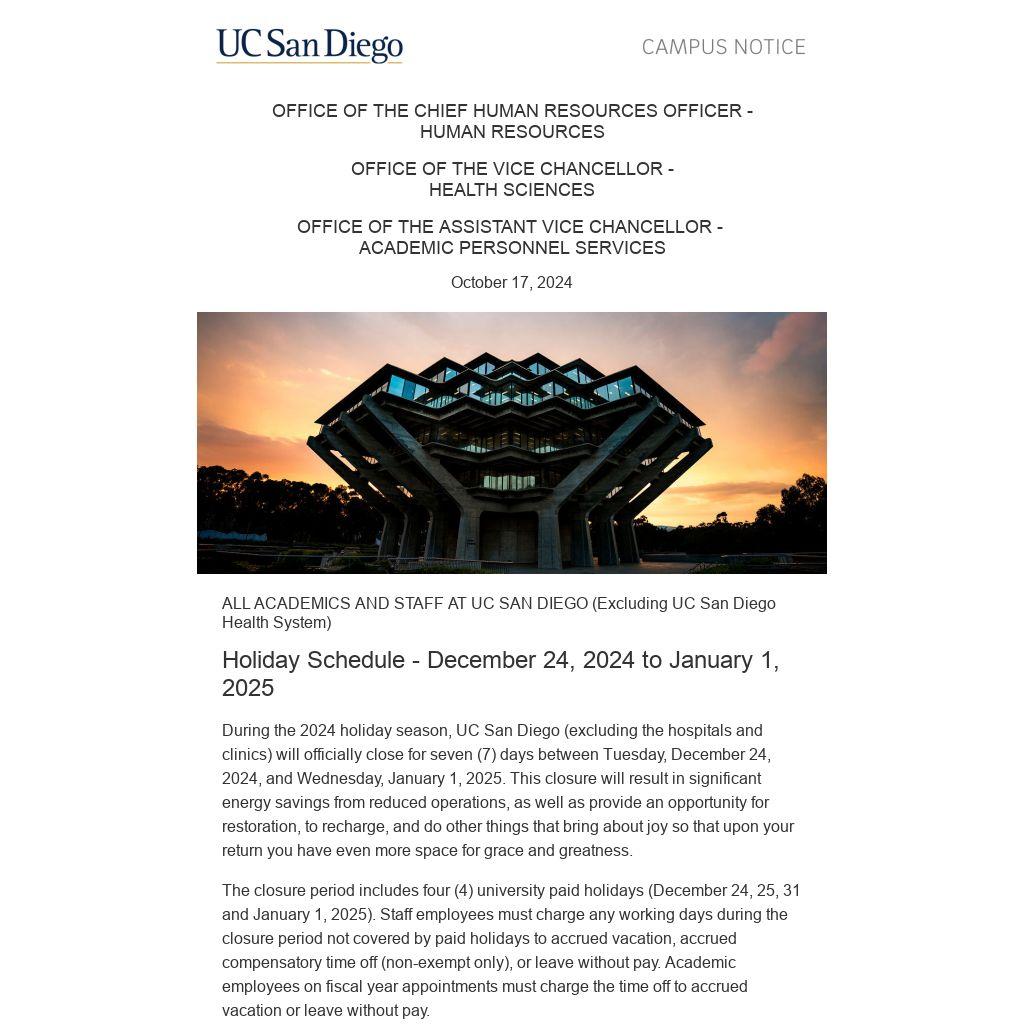 During the 2024 holiday season, UC San Diego (excluding the hospitals and clinics) will officially close for seven (7) days between Tuesday, December 24, 2024, and Wednesday, January 1, 2025. This closure will result in significant energy savings from reduced operations, as well as provide an opportunity for restoration, to recharge, and do other things that bring about joy so that upon your return you have even more space for grace and greatness.