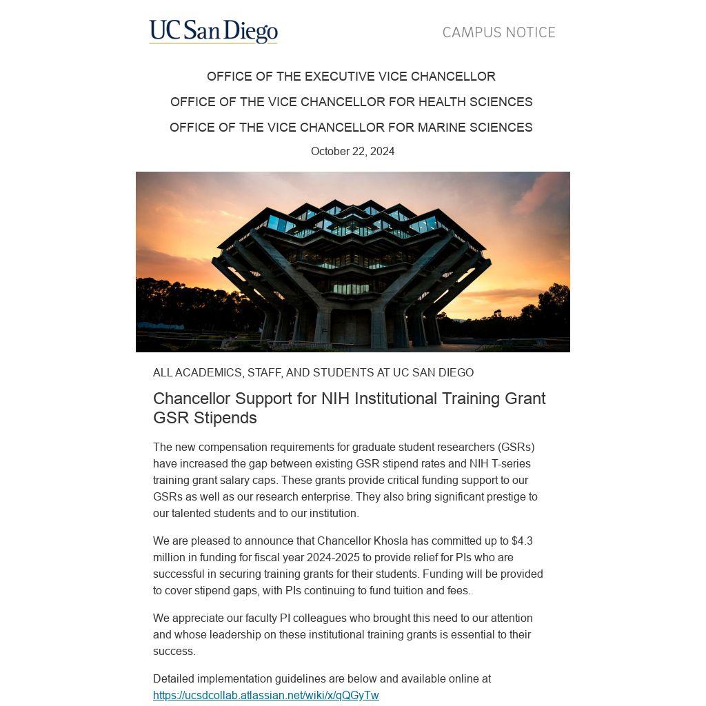 We are pleased to announce that Chancellor Khosla has committed up to $4.3 million in funding for fiscal year 2024-2025 to provide relief for PIs who are successful in securing training grants for their students. Funding will be provided to cover stipend gaps, with PIs continuing to fund tuition and fees.