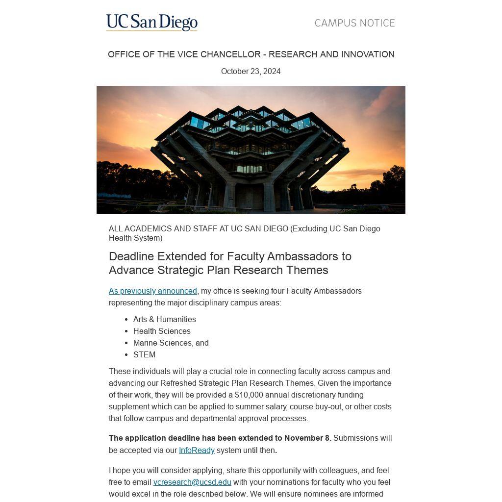 I hope you will consider applying, share this opportunity with colleagues, and feel free to email vcresearch@ucsd.edu with your nominations for faculty who you feel would excel in the role described below. We will ensure nominees are informed about the nomination and application process.