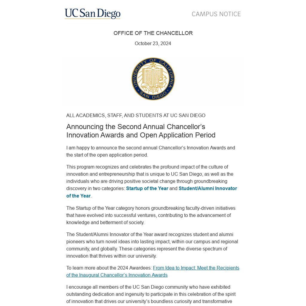 Thank your commitment to making UC San Diego a global leader in producing high-impact innovators whose trailblazing discoveries and initiatives are changing our world. I look forward to recognizing the exceptional contributions of our colleagues at the Chancellor’s Innovation Awards on February 25, 2025.