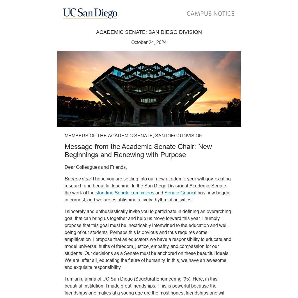 Buenos dias! I hope you are settling into our new academic year with joy, exciting research and beautiful teaching. In the San Diego Divisional Academic Senate, the work of the standing Senate committees and Senate Council has now begun in earnest, and we are establishing a lively rhythm of activities.