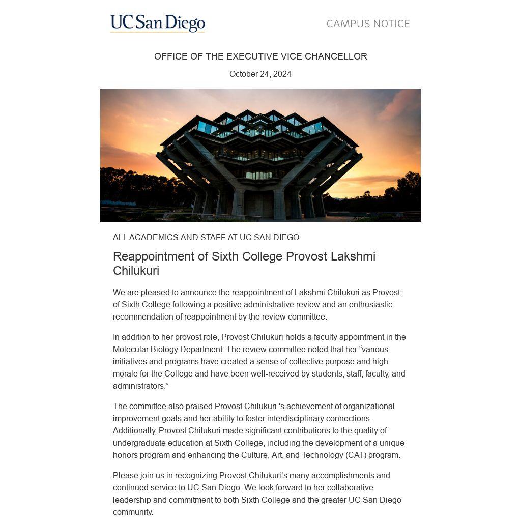 We are pleased to announce the reappointment of Lakshmi Chilukuri as Provost of Sixth College following a positive administrative review and an enthusiastic recommendation of reappointment by the review committee.