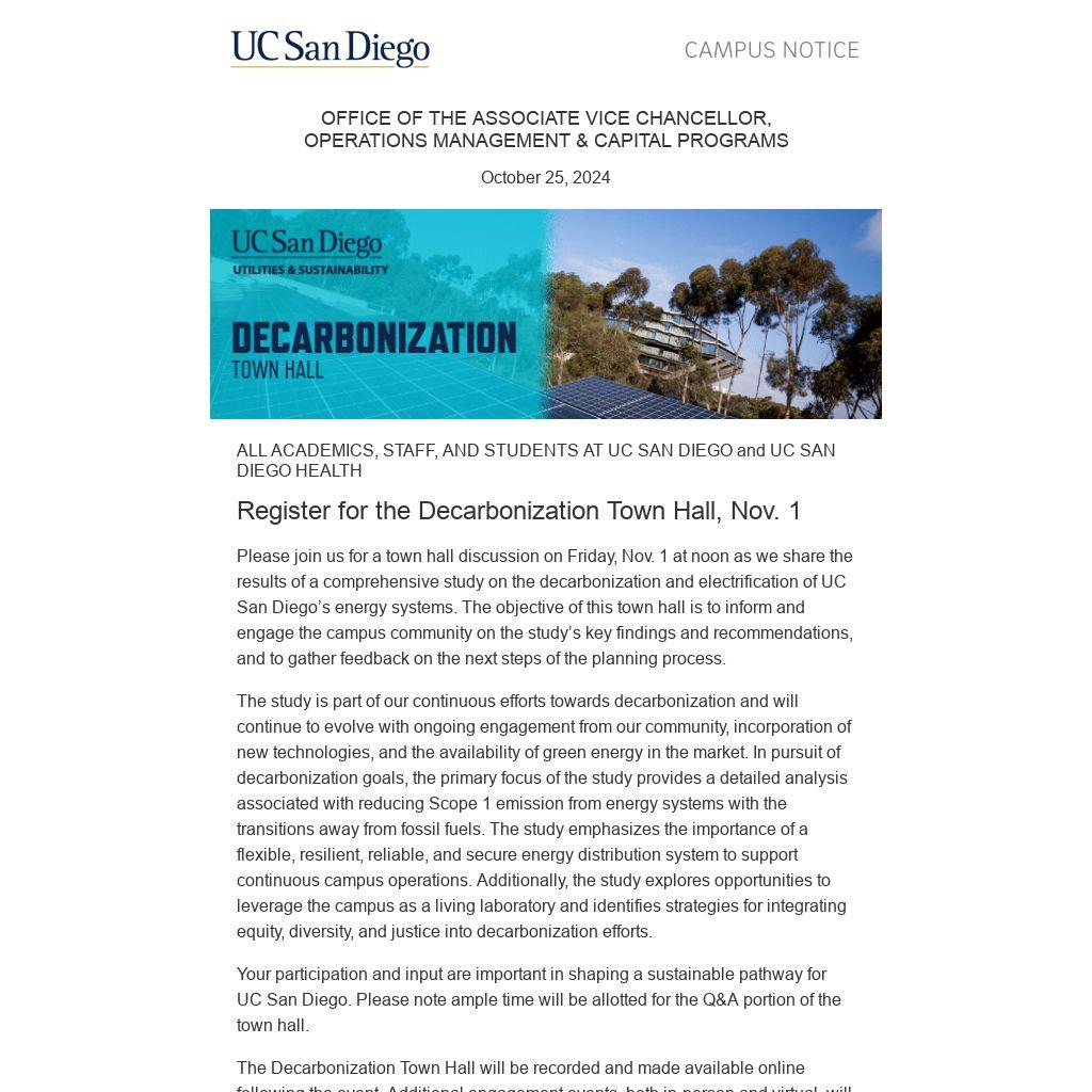 Please join us for a town hall discussion on Friday, Nov. 1 at noon as we share the results of a comprehensive study on the decarbonization and electrification of UC San Diego’s energy systems. The objective of this town hall is to inform and engage the campus community on the study’s key findings and recommendations, and to gather feedback on the next steps of the planning process.