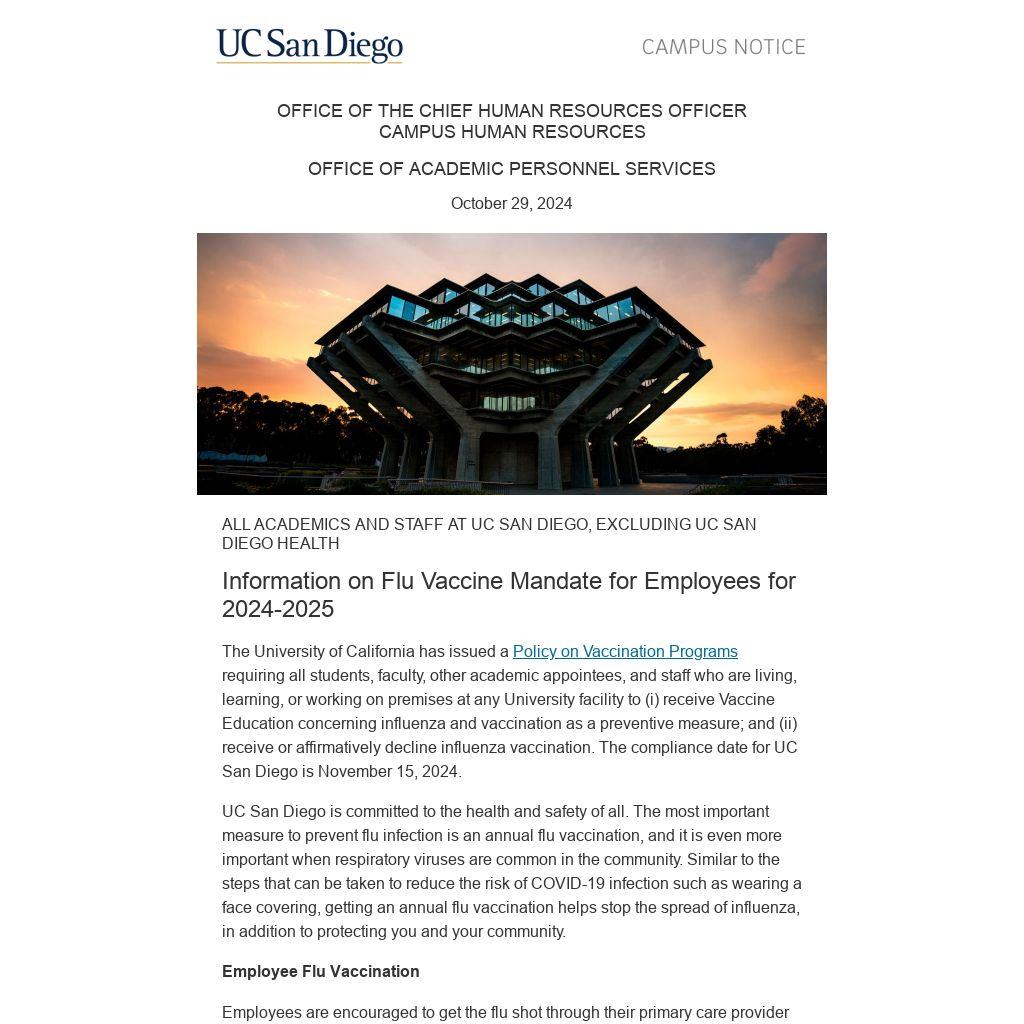 The University of California has issued a Policy on Vaccination Programs requiring all students, faculty, other academic appointees, and staff who are living, learning, or working on premises at any University facility to (i) receive Vaccine Education concerning influenza and vaccination as a preventive measure; and (ii) receive or affirmatively decline influenza vaccination. The compliance date for UC San Diego is November 15, 2024.